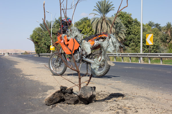Nichtsdestotrotz machte ich noch vor dem Frühstück den fälligen Ölwechsel und fuhr nach dem Frühstück los Richtung Assuan. Nach etwa 30 Km kam sie dann! Die WEISSE TAUBE. Sie startete am Straßenrand und flog direkt in meinen rechten Kühler. Sie starb augenblicklich - und mein Kühler auch.